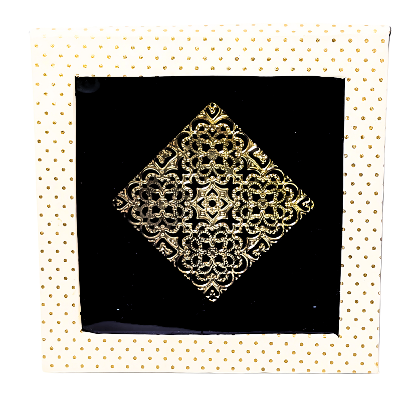 Design: Golden floral centrepiece with four ornamental Ganesha corners.