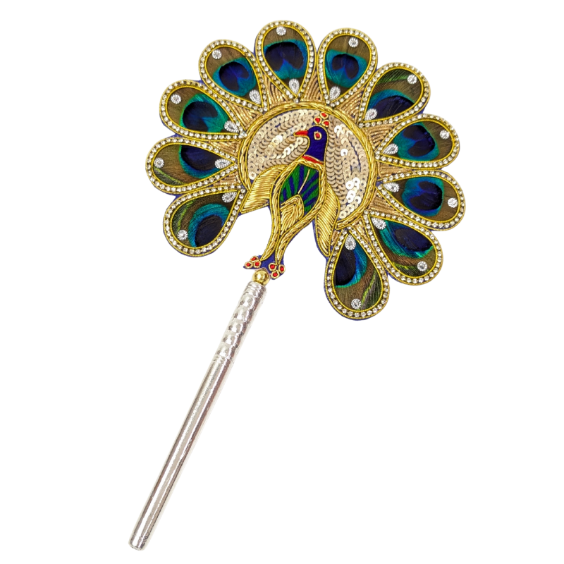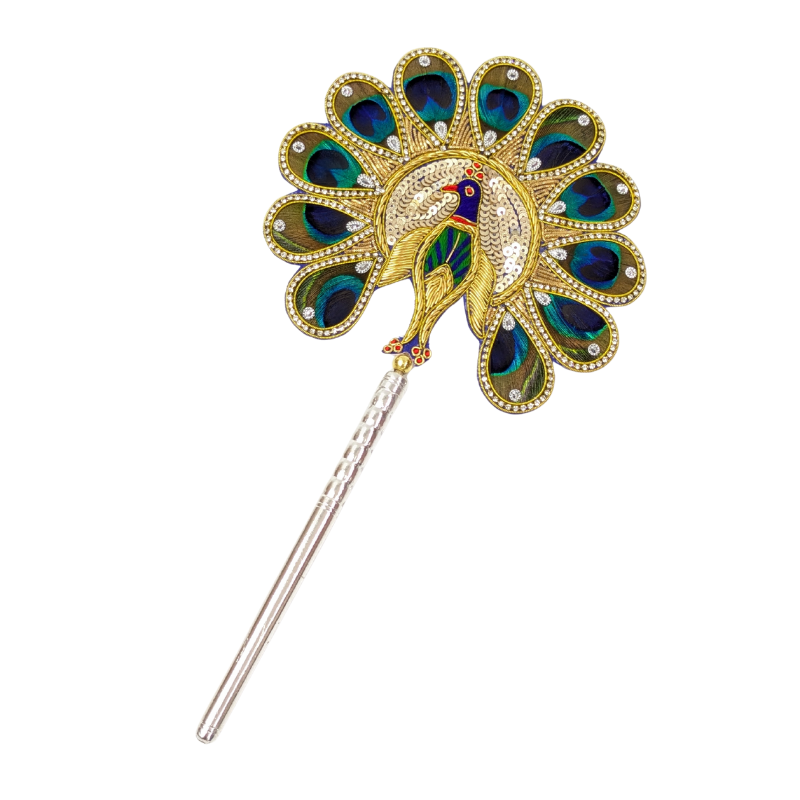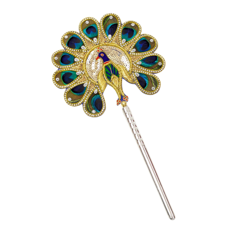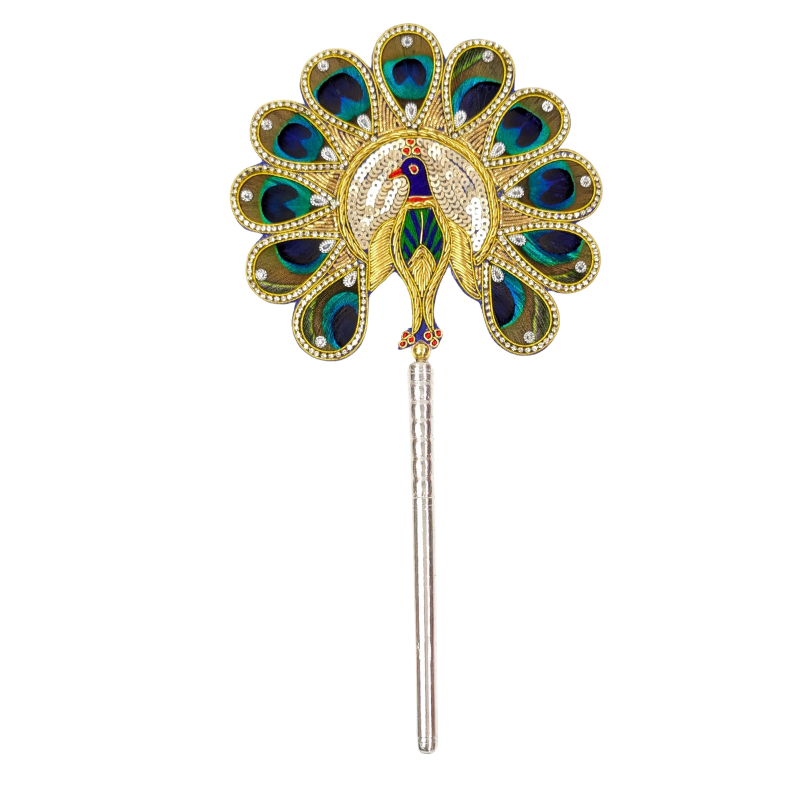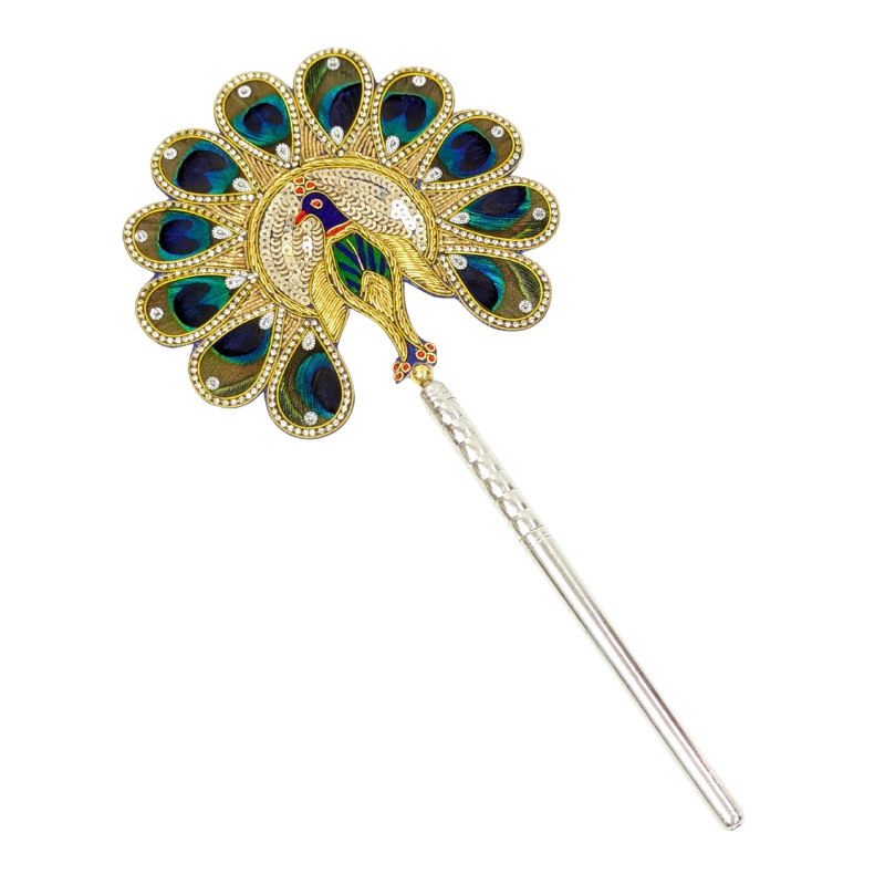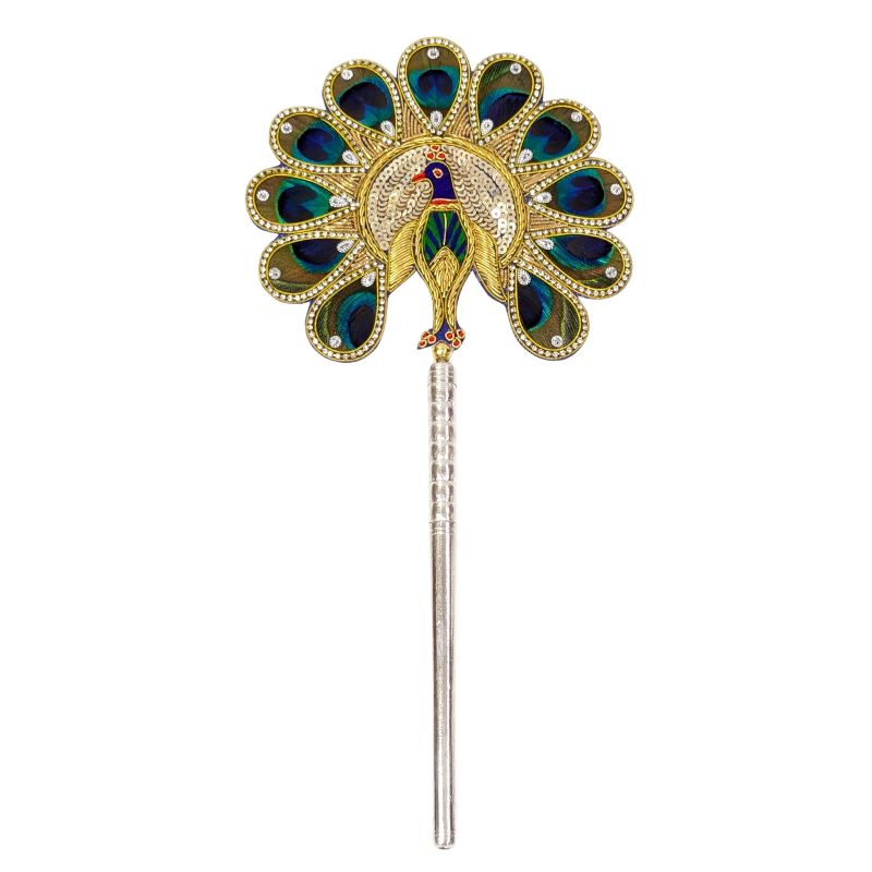 Natural peacock feathers (morpankh) patch with a light silver base. It is believed that keeping peacock feathers in the pooja space brings good luck and vibrant energy into the house or workspace. Peacock feather (morpankh) patch is gracefully bound by a decorative brooch and mounted on a wooden stick with a pure silver base with purity of 97%–99%. This is also an auspicious gift.