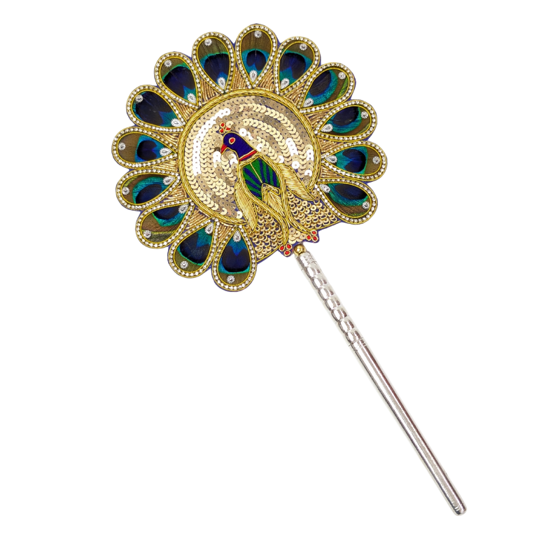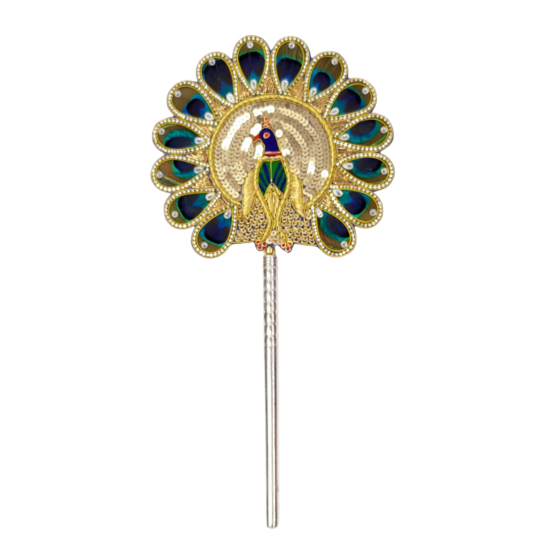 Natural peacock feathers (morpankh) patch with a light silver base. It is believed that keeping peacock feathers in the pooja space brings good luck and vibrant energy into the house or workspace. Peacock feather (morpankh) patch is gracefully bound by a decorative brooch and mounted on a wooden stick with a pure silver base with purity of 97%–99%. This is also an auspicious gift.