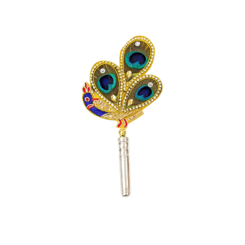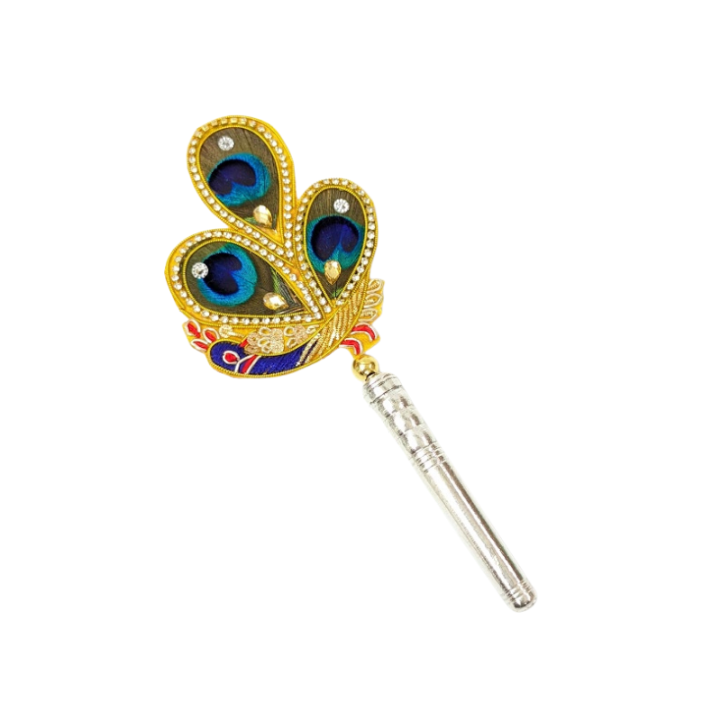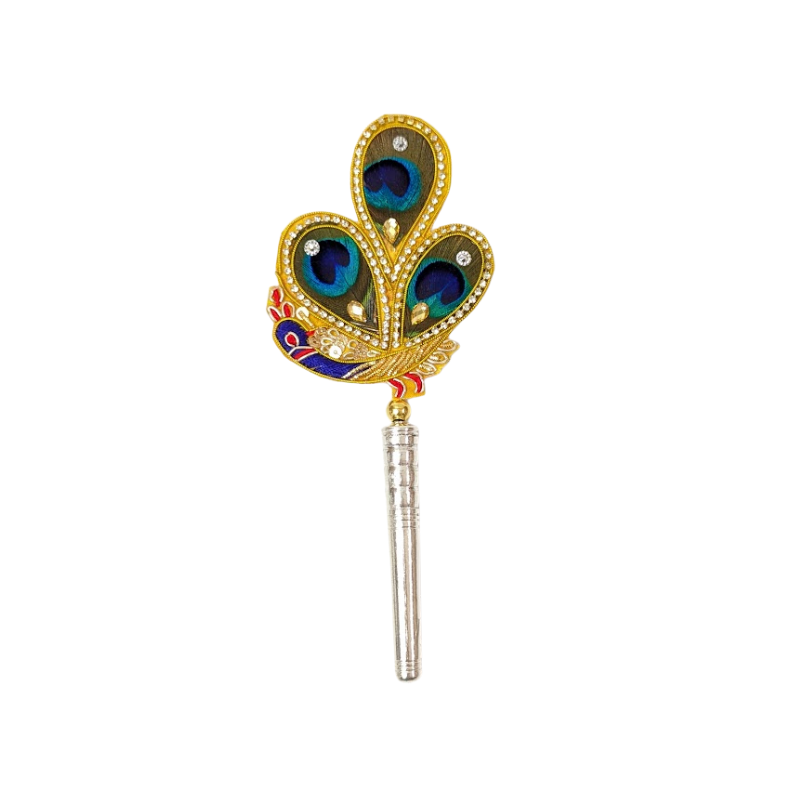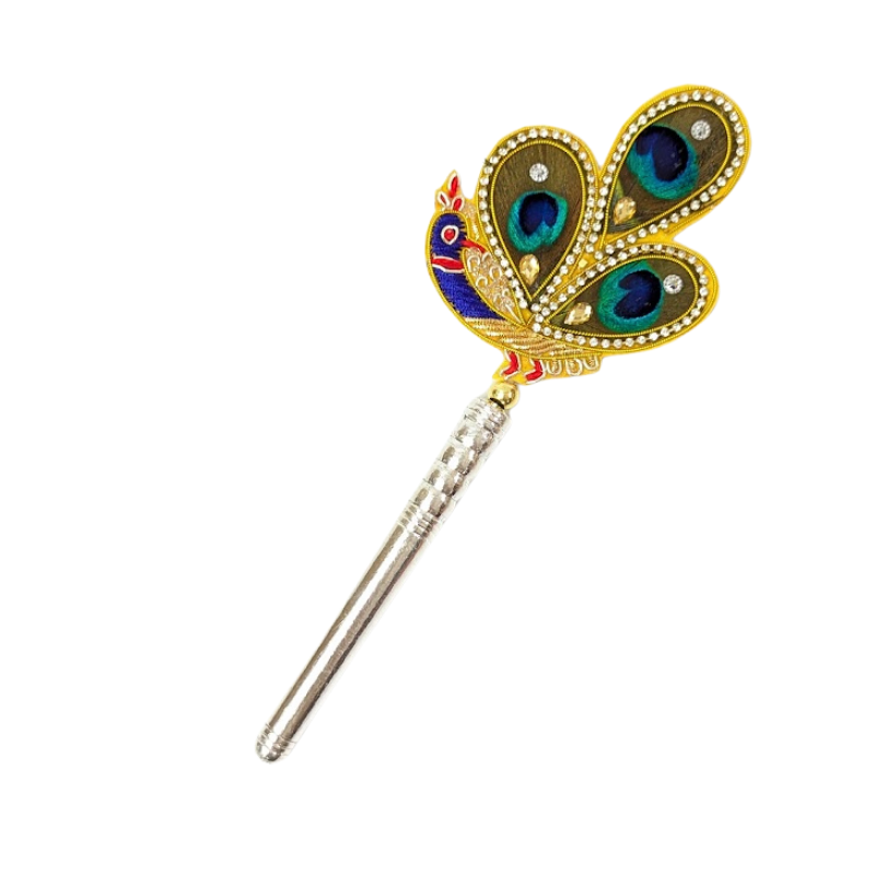 Natural peacock feathers (morpankh) patch with a light silver base. It is believed that keeping peacock feathers in the pooja space brings good luck and vibrant energy into the house or workspace. Peacock feather (morpankh) patch is gracefully bound by a decorative brooch and mounted on a wooden stick with a pure silver base with purity of 97%–99%. This is also an auspicious gift.