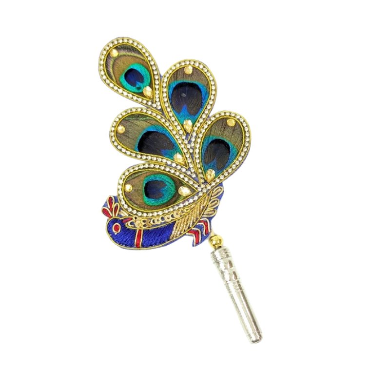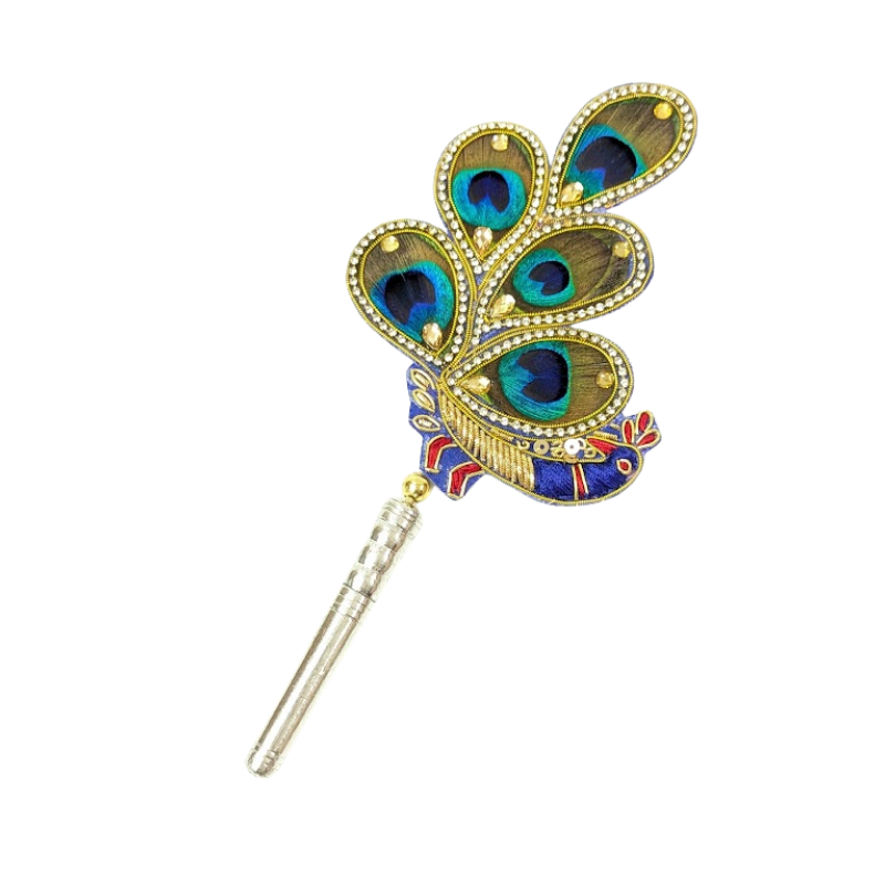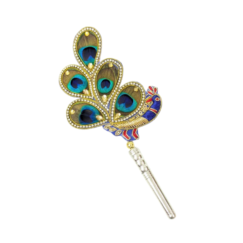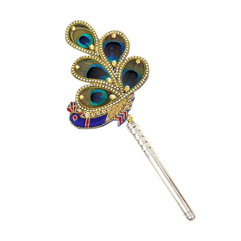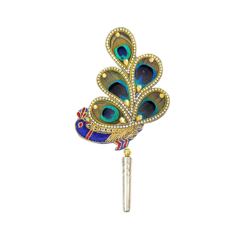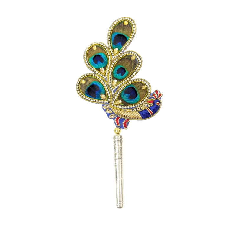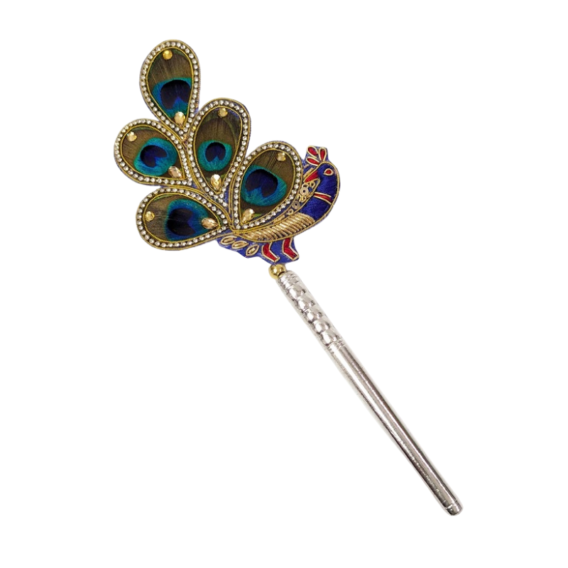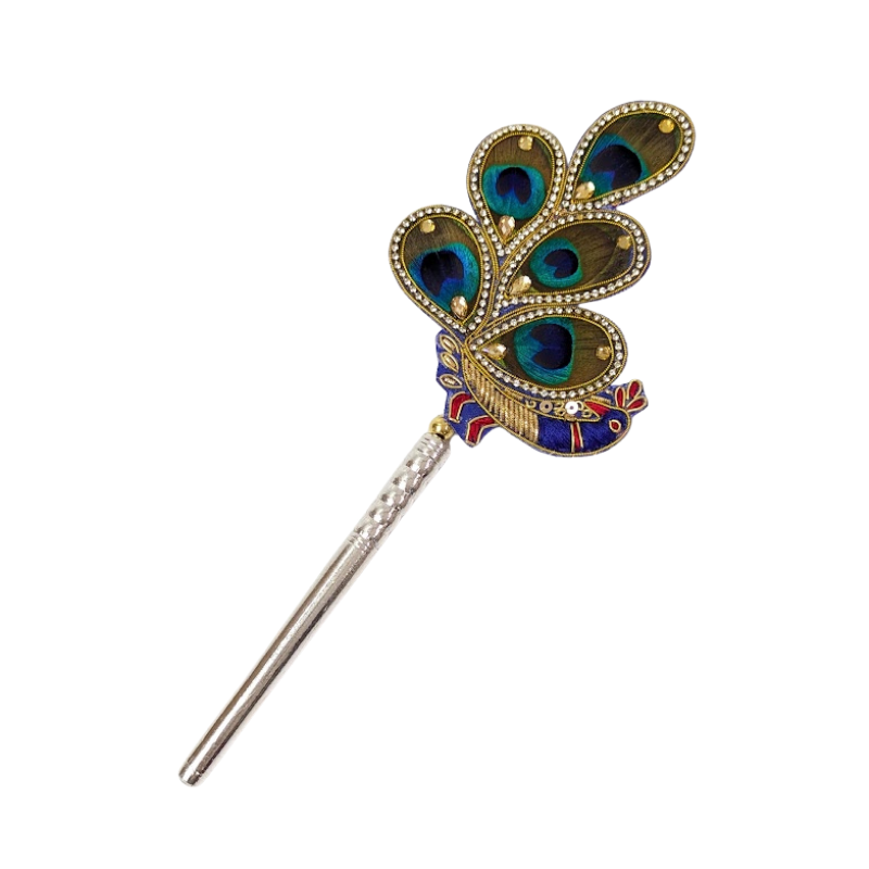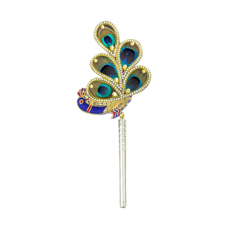 Natural peacock feathers (morpankh) patch with a light silver base. It is believed that keeping peacock feathers in the pooja space brings good luck and vibrant energy into the house or workspace. Peacock feather (morpankh) patch is gracefully bound by a decorative brooch and mounted on a wooden stick with a pure silver base with purity of 97%–99%. This is also an auspicious gift.